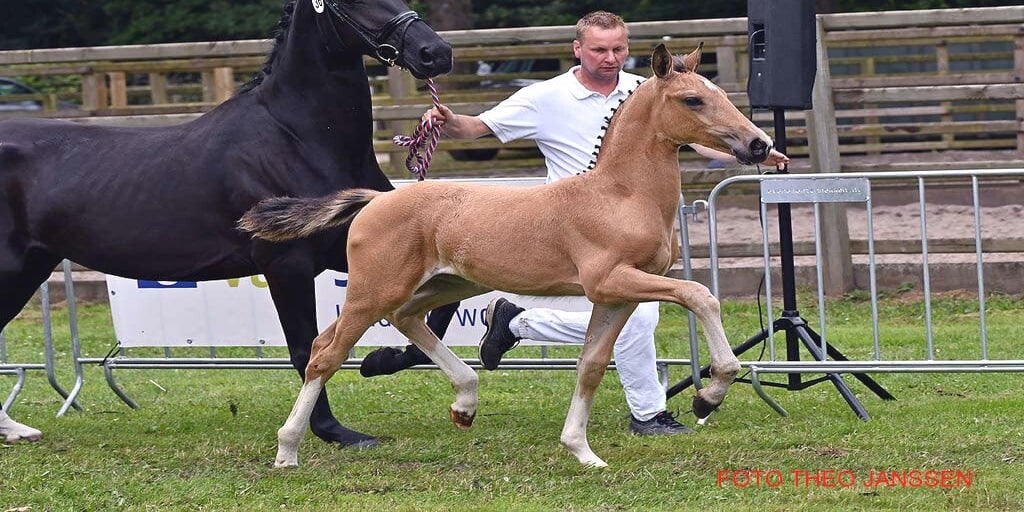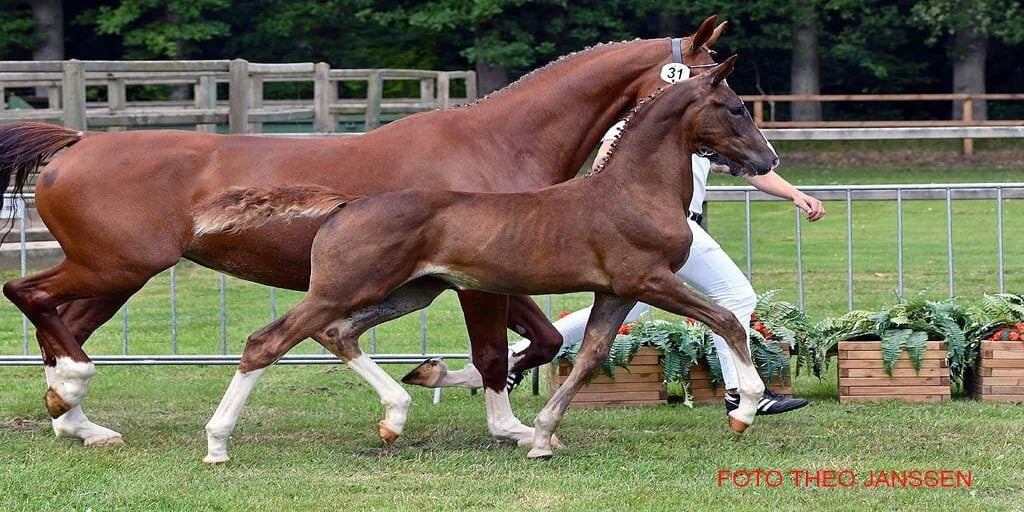 - Geeft maat, formaat, souplesse, beentechniek en schoudervrijheid aan zijn veulens
